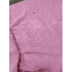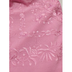 Hand-embroidered Manila shawl in natural silk. Scarf with pink embroidery and fringe.
