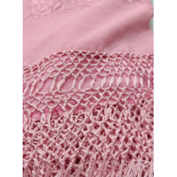 Mantón de Manila seda natural bordado a mano en seda natural. Pañuelo, bordado y flecos color rosa.
